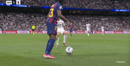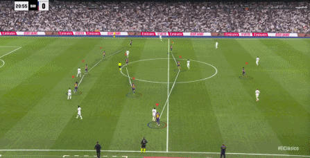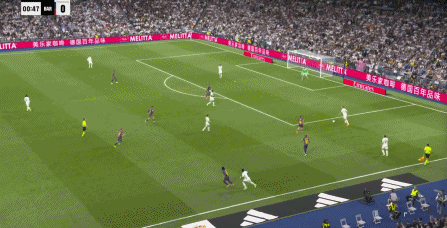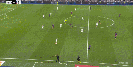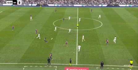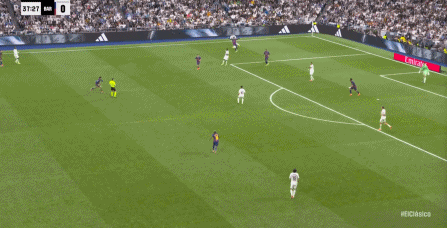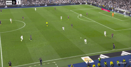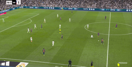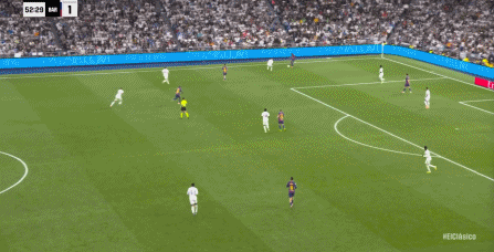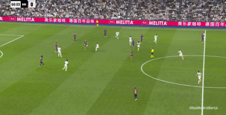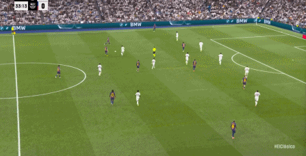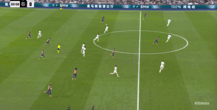 這個時候,比賽的天平已經(jīng)在向皇馬傾斜,但足球比賽終歸和運氣等因素緊密相關(guān),所以在第34分鐘,巴塞羅那通過帶球深入到貝林厄姆一側(cè),一度制造了開場以來的最好機會:
